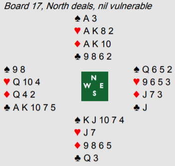 Nick (syd) havnet 4 spar etter at vest hadde doblet en kunstig kløvermelding så vi trodde vi ikke hadde stopper i den fargen. Det hadde vi slik det satt, men 4 spar ble altså kontakten.