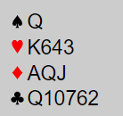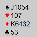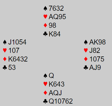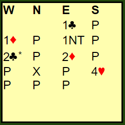 Det staret altså med 1 kløver (øst), pass fra syd og vest svarte 1 ruter ved det ene bordet. Nord passet, og øst sa 1NT. Syd passet igjen, og nå brukte vest XY, dvs. han sa 2 kløver som ba åpneren om å melde 2 ruter som vest passet på. Alt vel å bra for Ø/V, men det var ikke slutt. Åsmund Stokkeland var helt klar over at makkeren godt kunne ha en god hånd med en slik type fordeling at han ikke kunne melde verken første eller andre gangen. Så N/S kunne godt være litt "robbet". Stokkeland kom nå med en opplysende dobling, perfekt med 4-4 i major, men litt uvanlig at man melder seg på etter at alle de andre har meldt tre ganger! Enda mer uvanlig er at makkerparet som har passet hele tiden da melder utgang. For det gjorde Johnsen med syds kort, han hoppet rett til 4 hjerter!