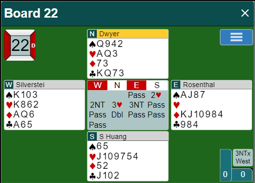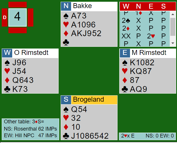 Ved det andre bordet fikk Tor Helness kløver ut til dame, og fikk dermed beholde ett inntak mer i vest, men vant kontrakten etter en tilsvarende spilleføring som svensken. Dermed ble det buttspill i åpen klasse.