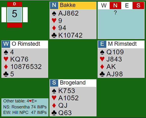 Nå er man framme i en avgjørende posisjon i spillet. Med kun ett inntak igjen utenom trumfen etter at ruter ess ble røvet fra deg i utspillet, er det viktig å gå i gang med hjerteren. Selv om man har både esset og kongen i kløver, er det bare ett inntak siden man kaster bort ett stikk ved å stikke over kløver dame.