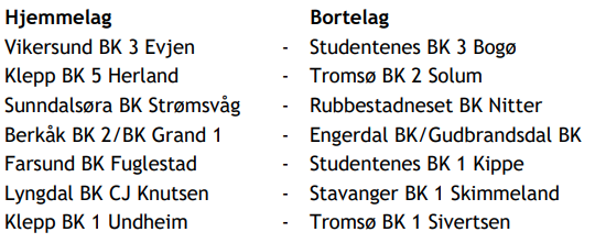 Studentenes BK 3, Klepp BK 5, Sunndalsøra BK, Engerdal BK, Studentenes BK 1, Stavanger BK 1, Tromsø BK 1.