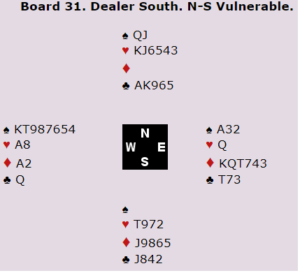 Der Israel satt Ø/V var NS med til 6 hjerter før vest meldte 6 spar. Nord trodde han hadde fått dem der han ville og doblet, men slemmen stod og det ble +1210 til Ø/V.