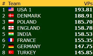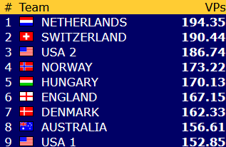 Norge har 113,23 VP etter 13 av 23 runder, og ligger foreløpig på 19.plass blant de 24 lagene. Avstanden opp til åttendeplassen er drøyt 32 vinnerpoeng.