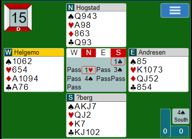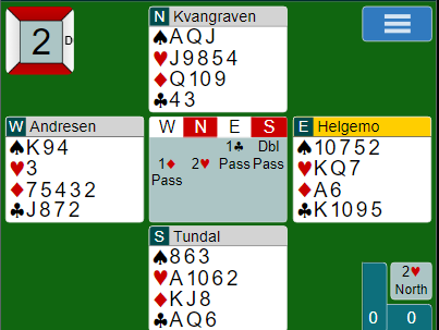 Hvis en bruker det slik er 3 hjerter et alternativ, men jeg synes absolutt 2 hjerter er greit med disse kortene, altså. Det ser ikke ut som om AQJ i spar har full verdi med åpneren bak deg, og det finnes skarpere 10-poengere med femkorts farge som kanskje er mer aktuelle for den nevnte meldingen, om avtalen da er slik at dobbelthoppet viser den type hånd.