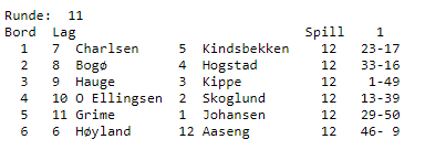Med fire-fem spill igjen leder CHARLSEN med 16-2. Både KIPPE (mot Hauge) og JOHANSEN (mot Grime) har fått opp bra ledelse i sine kamper. Alle de tre lagene har gullsjanser om CHARLSEN skulle slakke av. Vi kommer tilbake med halvtidsresultatene om litt.