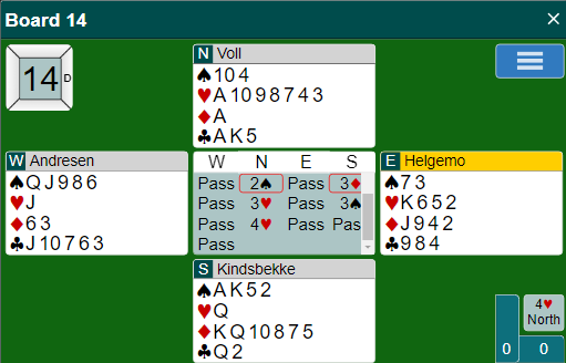 I Volls 4 hjerter ble det tolv stikk, KINDSBEKKEN +480.