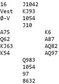 Det var litt uklart hva 4NT var ment som (vests 6NT tyder på at han mente 4NT var invitt) da nord spurte om det før han skulle spille ut. Så her var du ikke så mye informasjon som kunne brukes. Hva spiller du ut?