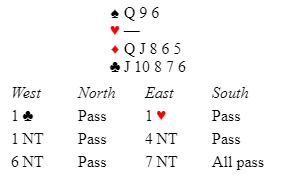 Om øst hadde overført til hjerter og så meldt 7 hjerter ville det vært nord som avgjorde spillet med sitt utspill. Han kunne godt ha spilt ut kløver knekt, storeslem til notering.