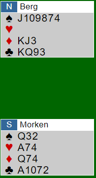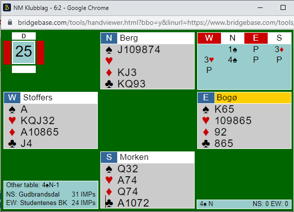 Der Helgemo satt vest og Grude øst for Stud 3 fikk Grude spille 3 hjerter doblet etter at N/S hadde vært med i meldingene.