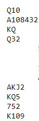 Ø/V har to ess, men hvis de ikke tar for dem kan det bli tolv stikk. La oss si du er i 4 hjerter som nord, og øst spiller ut spar 5. Da kan du ta ut trumfen og innkassere sparstikkene med avkast av to ruter. Øst viser seg å ha startet med dobbelton spar og dobbelton trumf. På tredje og fjerde spar kaster han to kløver. Nå handler det om å tippe hvor kløver knekt befinner seg, og det valget svinger mange poeng i parturnering! Hva ville du gjort?