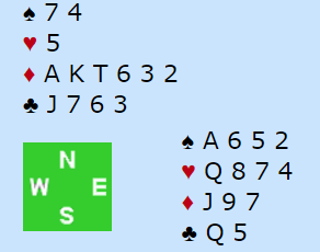 Merk at utgangen kan betes med en runde ruter og skift fra nord i andre stikk. Idet syd kommer inn på trumfesset kan han i så fall spille ruter til nord og få en tredje runde av fargen som han kan sette i trumf på.