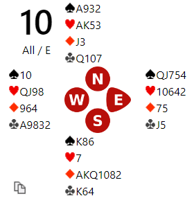 Hjerter ut til esset og kløver opp igjen til østs ess. Nå tok spillefører til å ta ut trumfen....og ikke lenge etter kan de notere intet mindre enn 10 dobla bet!