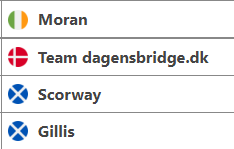 Også mix-laget trøblet litt i starten. Det ble to tap, men en fin seier mot England (10 IMP). De ligger på 14.plass blant 22 lag.