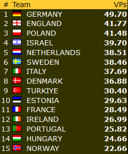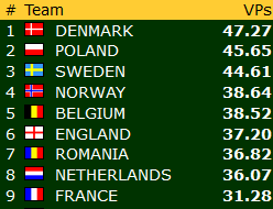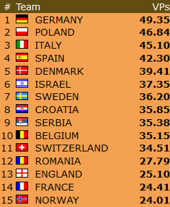 Lederlaget i OPEN, Nederland har fått opp en liten luke, 14 VP foran Sveits og 20 VP foran Norge.