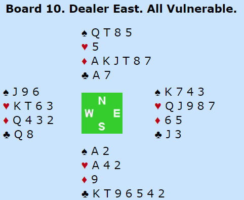 Den franske syd var i samme situasjon som Basmo idet også hans makker doblet opplysende mot 1 hjerter. Men Frankrikes syd satset på det han trodde var sikre +600 eller mer i 3NT. Da var ikke sikkert i det hele tatt...