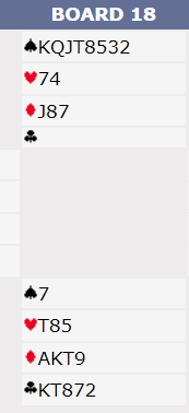 Mot 6 hjerter spilte Kjell Aadahl ut sp 5 og det så greitt ut å vinne. Men da trumf A og D etter sp A ble trukket var Jan Thore Karlsen i Øst med 10xxx med å lage problemer. Hvordan ville du løst dem, du rensker jo deg selv for trumf hvis du trekker 4 runder trumf? 3 par var in6 hjertrer, bare Jan Erik klarte seg, og av 4 andre i utgang var det bare ett som klarte å få 12 stikk i 4-5 hjerter.
