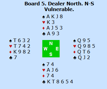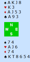 Ruter ess tok altså første stikk selv om spillefører ikke dekket med kongen, og kløver tilbake ga nord en stjeling.