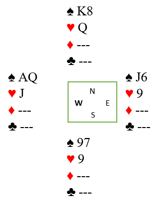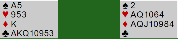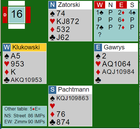 Og det var rett å melde over 5 spar og, forutsatt at man ikke finner utspillet mot den kontrakten. Men å melde slem N/S er feil i teorien siden 5 spar er to bet og 6 ruter/hjerter en bet. Så ble det noen sekunder plutselig rett å melde 6 ruter, for N/S fikk på en måte motparten dit de ville da Ø/V gikk i 6 spar. Men det utviklet det seg til et skikkelig katastrofespill når utspillet ikke ble funnet mot 6 spar.