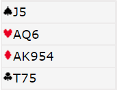 Ru J ut fra Syd, esset fra Nord og din konge blir felt. Nord spiller så kl 5 til din knekt som Syd stikker med damen og fortsetter med å ta for kl A der Nord legger 2-er. Straks etterpå kommer du inn i bordet og trekker hj D med 6-er fra Nord. Hva gjør du?