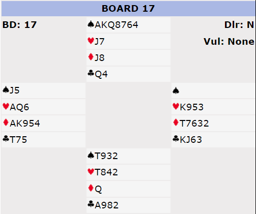 Min lagkamerat på vests stol ved det andre bordet meldte inn 3 ruter etter samme start som hos oss. Da sa selvsagt øst 5 ruter over nords 4 spar, og 5 ruter fikk de spille. Spillefører spilte på et tidspunkt kløver til knekten som dro esset, og senere falt kløver dame under kongen. Tolv stikk, Ø/V + 420.
