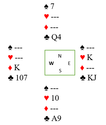 På spar 7 er øst ferdig. Kaster han hjerter konge forsvinner kløver 9, og bordet står. Hvis øst kaster kløver knekt forsvinner hjerter 10 fra syd og liten kløver fra nord tar med seg singel konge og kløver dame gir det tiende stikket.