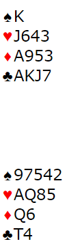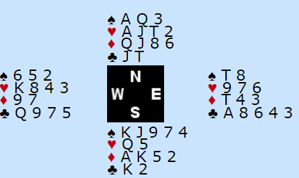 Det ser naturlig ut å havne i sparkontrakt etter syds åpning. Hvis det skal spilles slem er vel 6 ruter spilt av syd best. Da er kløver konge gardert. Hvis ruter sitter 3-2 kan sparfargen fumgere som avkast for kløver hos nord. Men det koker ned til at hjerter konge må sitte i saks uansett, for om de tar for kløver ess kan ikke mer enn to hjerter kastes fra nord på spar. Men i ruterkontrakt kan det kanskje bli tolv stikk selv om hjerter konge sitter bak, hvis Ø/V ikke får fatt i kløver ess med det samme.