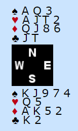 Solli sitt åpningsbud viste 20-21 jevn hånd og med to gode 5- korts farger hadde jeg god tro på slem. Overføring til spar og så 4 ruter som var ment som ekte farge utløste kontrollmeldinger og jeg valgte å satse på lilleslem i grand. Syd spilte ut hjerter og Nord sin knekt kunne Terje vine med damen. Hvordan vinne?