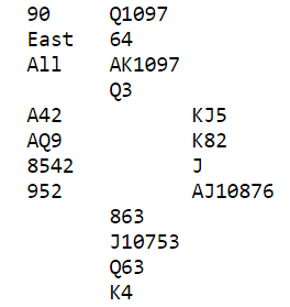 N/S har fem ruterstikk og ett kløverstikk å hente. Det var også flere Ø/V-par som gikk bet i 3NT, noen av dem gikk to bet (N/S +200), og noen gikk bet i delkontrakter i grand.