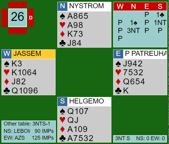 Etter å ha tatt hjerterstikket sitt spilte vest kløver til bordets knekt. Så fulgte spar til tieren, spar dame, og to ruterstikk + spar ess ga ni stikk i alt (3+2+2+2=9). Det ga 12 IMP til lag LEBOWITZ som ble holdt inne i kampen, men det hjalp ikke. Kampen ble tapt likevel.