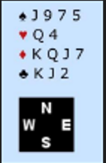 Syd har åpnet med 1 hjerter, minst femkorts farge. Senere har han vist firekorts spar og en god hånd med tre nøkkelkort med spar som trumf (essene og trumf konge).