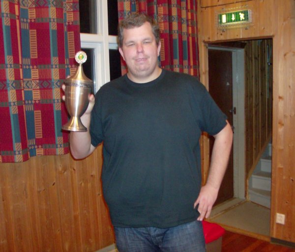 Baard Olav Aasan og Bård Kåre Græsli tok seieren i årets Snåsa Cup, foran Per Arne Flått og Jørn Arild Ringseth. Disse to parene skiftet på ledelsen mot slutten av turneringen, vinnerne spurtet best i sisterunden og vant med 2 poeng så det var spenning til siste kort var lagt. Den siste pallplassen tok Lars Tuseth og Per Erik Garli etter en sterk siste sesjon. Jørn Arild Ringseth vant for øvrig vandrepokalen som går over fem år til odel å eie. Seierspallen i Snåsa Cup 2009. Ellers debuterte Espen Flått i turneringssammenheng og gjorde sine saker veldig bra. Han og makker Eirik Nagelhus lå på den siste premieplassen etter første sesjon og endte opp på middels til slutt som er mer enn godkjent. Espen går nå nybegynnerkurs og har enda noen kvelder igjen av kurset, så dette ser lovende ut. Espen Flått debuterte under Snåsa Cup. Årets Snåsa Cup ble et vellykket arrangement og det er bra da turneringen har blitt avlyst de to siste årene. Ragnar Davidsen var spillende turneringsleder og hadde full kontroll slik at alle trivdes. Snåsa BK hadde i tillegg fått tak i masse spurtpremier fra det lokale næringslivet som alltid er populært. Ellers skryt til kjøkkenet som serverte knallgode kjøttkaker og dessert til meget hyggelige priser. For min egen del var dette mitt beste bord under turneringen. Ove Reidar ba meg også nevne de nydelige vaflene, som de sikkert hadde sukret godt. Jørn Arild Ringseth sikret seg vandrepokalen. Takk til Snåsa BK for en flott turnering, det er bare å begynne å planlegge neste års Snåsa Cup for turnering blir det. RESULTATER