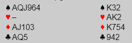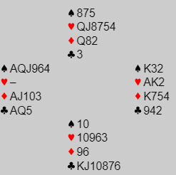 Svaret avhenger vel av om du er god til å tippe, for tippes hvor ruter dame befinner seg blir det fort tretten stikk her. Dessuten kan jo den damen være singelton slik at det blir "claim" nokså tidlig. Men om to kløver kastes på A-K i hjerter må ruteren sitte 3-2 i tillegg hvis du spiller på damen hos nord. Om det spilles på ruter dame som hos syd kan godt ruteren sitte 4-1.