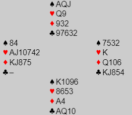 Syd stakk med ruter ess i tredje stikk. Spar til knekten ble fulgt av kløver til tieren. Mer spar til nords ess ble spilt, så kløver til damen. Deretter kløver ess og sparestikkene, det fjerde sparstikket ruteravkast fra nord. Øst måtte følge farge hele tiden, og nå fikk Ø/V kun to stikk til slutt som sammen med de to første stikkene ga kun fire motspillsstikk, N/S -670!