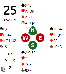 Med SCORWAY N/S ble kontrakten 3NT. Det var ingen dårlig kontrakt, men 4 spar er mye bedre siden det er kun en hjerterstopper (og en ruterstopper). Med stor hjerter ut fra øst var det kun åtte sikre stikk i grand selv om kløveren gir fire stikk. Sparfargen måtte løses for å vinne utgangen.