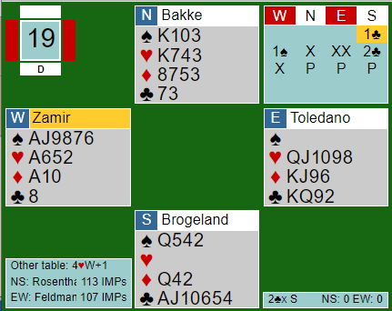 Ved det andre viste Jansma (øst) hjerterfargen selv om nord doblet som normalt lover hjerter, samme start som der nordmennene satt N/S. Og da øst fortalte om hjerter blåste vest ut i 4 hjerter. I den kontrakten ble det elleve stikk. Med +650 ved det bordet ga spillet 8 IMP til Rosenthal. Men like etter dette tok Feldman over føringen i kampen.