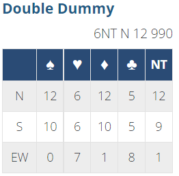 Merk det som står om de der Double Dummy computeranalysene. Nord kan altså vinne 6 spar og 6NT, men syd kan ikke vinne mer enn ti stikk i sparkontrakt! Det er dog helt utenkelig å spille ut hjerter dame som må til for å holde 4 spar nede på ti stikk. Her er analysen som står under spill 14 på resultatsiden:
