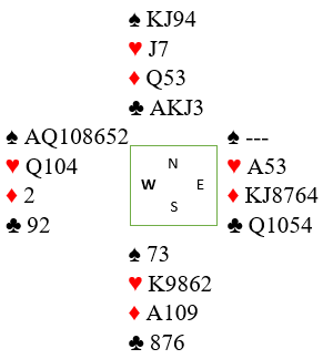 Her kan jo nord passe på 4 spar hvis avtalen er ifølge de mer moderne stilen for dette, for nord liker dårlig å høre et uttak fra makkeren, spesielt om syd melder hjerter. Men passer nord går det pass rundt, og da får de +400 for fire udoblede bet. Det er egentlig ikke noe dårlig resultat siden N/S som nevnt normalt ikke vinner utgang i dette spillet. Men i denne kampen ville det kostet 12 IMP å spille mot 4 spar udoblet (-1100 og +400 gir -700).