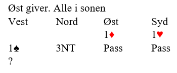 Det er alt for vill gambling å si 4 spar. Husk nord meldte 3NT, så å la seg friste av den fine syvkortsfargen kan bli kostbart.