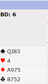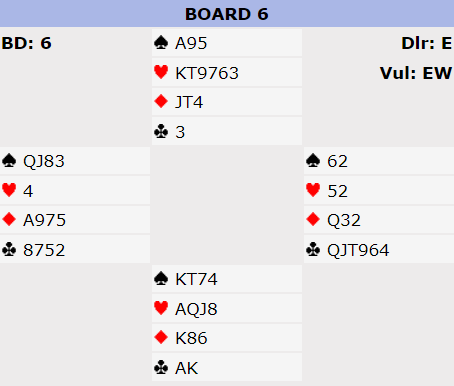 Bare Arne Marthinussen- Fred Hansen kom i 6 NT uten spar ut og dermed 13 stikk. Jeg og en spiller tii fikk 11 stikk i 6 kløver! Monika fortsatte nemlig med ny spar til stjeling siden fargen satt 6-1 imot! Bridgen er ofte merkelig uforutsigbar.