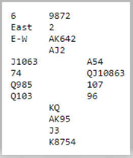 9mhp men anstendig 2-fargehånd. De som bruker Romerske 2- åpninger kan velge å åpne med 2 hjerter, 5-5+ i hjerter og minor, men Lødding kunne ikke det og valgte i stedet knallharde 1 hj som åpning. Da gikk resten av budserien slik