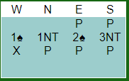 Mange bruker dobling som «finn et annet utspill» da den som dobler kan ha mange stikk i en annen farge, og de som melder 3NT har annonsert stopper(e) i den fargen vi har meldt. Her ble det fryktelig galt når øst forsøkte å treffe makkeren et annet sted enn i spar. For med spar ut kan 3NT betes. Vest kontrollerer motspillet så ikke spar konge gir inntak til syd senere, etter at en kløverfinesse er tatt. Dermed får spillefører kun ett kløverstikk. Hvis nord presses til å spille hjerter fra hånden kan han ende opp med å vinne kun to sparstikk, ett kløverstikk og fem ruterstikk – en bet. Vest kan dessuten få godspilt sparen før spillefører har noen mulighet til å få tak i det niende stikket.