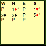 Det er ikke nødvendigvis noen feil idette meldingsforløpet. Det kan godt være helt normalt, og 5 ruter kan vel værer en fin-fin kontrakt. Men merk at det står et * bak 5 ruter. Det betyr at syd har alertert sin egen 5 ruter-melding, men det er det kun øst og vest som ser når man spiller med skjermer, eller i skjermmodus som brukes i lagkamper på Realbridge.