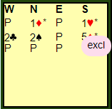 Exclusion er normalt når man hopper til fem-trinnet i en farge man er renons i for å spørre om antall Key-Cards UTENOM renonsfargen. Syd mente 5 ruter som Exclusion med spar som trumf, nord var av en annen oppfatning og trodde det var stoppmelding.