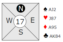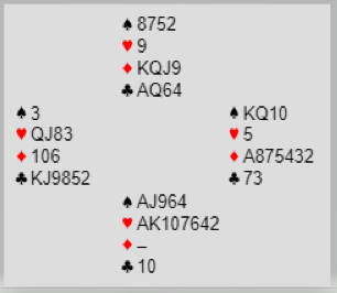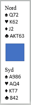 Men nord hadde ikke til 3 ruter, han var for sterk til det. Så nord åpnet med 1 ruter, og da er innmeldingen 1NT opplagt. I så fall vil vest undersøke litt da hans kort tilsier annen kontrakt enn grand. Men det blir ikke fred å gå, nord melder mer: