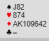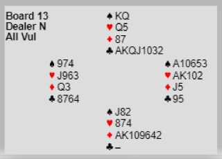 Det er på ingen måte nok stikk til å vinne denne utgangen om ikke kløverfargen blir godspilt. Det er dog et åpenbart problem, idet kløveren godspilles mot Ø/V få komme inn, og om det er øst som kommer inn er det lett å se at det går fryktelig galt om ruteren sitter slik som det ser ut, A-Q sjette (fra start) hos vest og to små hos øst. Øst spiller ruter gjennom syds konge, vest får fem ruterstikk og det blir to bet.