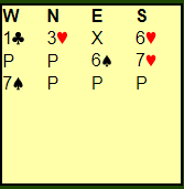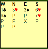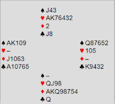 Denne storeslemmen kan selvsagt gå bet, men det må kløver ut. Da kan de få tak i to bet i 7 hjerter, ett kløverstikk samt en ruter til stjeling. Det ville likevel gitt kun +500 til Ø/V, småtteri mot +2210 til Ø/V ved det andre bordet. Men det skulle bli verre for dem som lot N/S spille 7 hjerter doblet, for øst valgte å spille ut spar. Spillefører stjal, tok ut trumfen og satt opp ruterfargen med en stjeling. Dermed ble det vunnet storeslem ved det bordet også, men der altså til N/S som noterte seg for +1770. Den søte dobbelscoren +3980 ga uvanlige 23 IMP på ett spill.