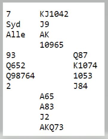 Både spar og ruter satt OK imot, men kan det ikke 6 spar betes? Jørn Fjæstad klarte å velge hj 5 og dermed fikk han og Gunnar Pettersen to stikk i den fargen, bet altså! +8 i stedet for -6 som pådytt betydde.