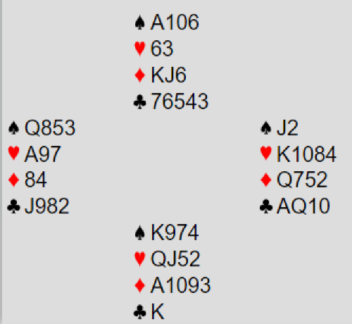 Men denne varianten hadde de ikke avtalt. Så syds 2 ruter var utgangskrav (XY), og 3 ruter var naturlig melding og viste 2-2-4-5, eller noen ganger 1-3-4-5 hvis hånden innebar et gjenmeldingsproblem som det absolutt var denne gangen. Da nord sa 3NT over syds 3 spar som viste minst sekskorts farge var det ikke lett å vite hva som er riktig med syds kort. Det kan stå slem, men det kan også være to hjertertapere fra start.