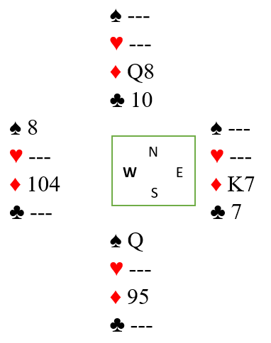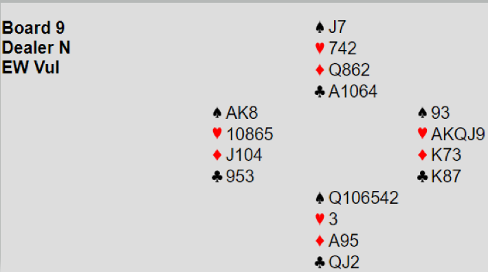 Spillefører kastet spar 8 da hjerter 9 ble spilt. Så spilte han spar til kongen. I det stikket skulle nord ned på tre kort og ble offer for en skvis etterfulgt av innspill. Hun måtte holde to rutere, og dermed ble det kun plass til singel kløver 10. Den fikk hun for da spillefører ba om kløver 9 fra bordet, og nord måtte til slutt spille ruter unna Q-8 til spilleførers kombinerte saks, 10-4 mot østs K-7.