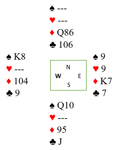 Den alternative vinnervarianten i diagramsituasjonen er at spillefører kaster kløver 9 fra bordet. Så spar til esset. Nord må holde to rutere og derfor kløver 10 singel i tre-kortsposisjonen. Innspillet er ikke lenger mulig siden vest ikke har igjen kløver, men nå forærer spillefører syd ett sparstikk ved å spille spar 8. Det ser slik ut: